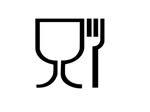 对符合食品级安全的产品可在包装或包装表面上显示下图的标志, 表示“产品可适用于包装食品”(例如:炊具、餐具、电器产品) 。对于功能明显的食品接触产品可直接标明其功能特性(如:汤勺、碗等),或用如下文字描述: 1)“for food use”或“food grade symbol”文字;2)特殊使用、安全使用的说明及预防措施需列出(例如:不能于微波炉使用;不适用于脂肪类食品)。